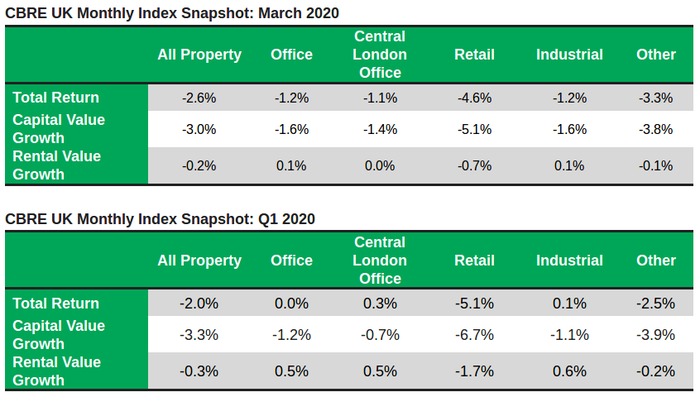 Capital values fell by -3.0% across all UK Commercial property in March 2020, according to the latest CBRE Monthly Index. This was almost entirely driven by a 14bps rise in yields, as rental values decreased just -0.2%. Total returns were -2.6%. Over Q1 2020, capital values fell by -3.3%, while rental values decreased -0.3%. All property total returns were -2.0% for the quarter.