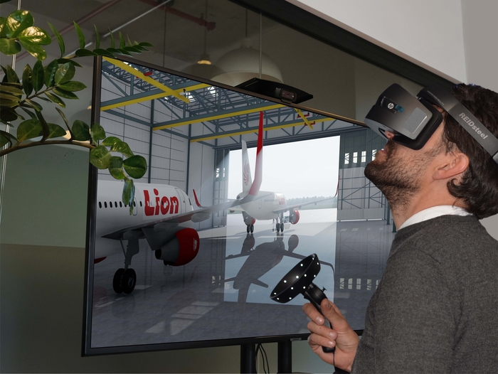 Structural steel firm REIDsteel used a virtual reality presentation to win a contract for a new hangar with South East Asia airline Lion Air. Picture shows model demonstrating VR headsets with the Lion Air hangar on screen.