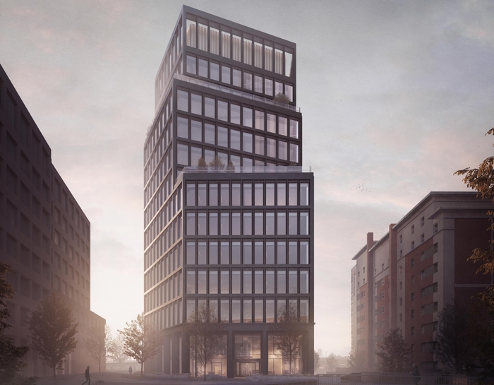The office accommodation spans 12 storeys. OBI has been appointed to market the scheme.
