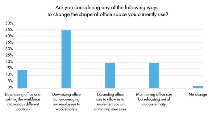 So, we know that organisations are looking to move, they are looking to move quickly, and they are looking for flexible contracts, but what about the spaces themselves? Well, 57% of businesses will be looking to downsize and more specifically 44% will be looking to downsize and encourage their people to work remotely. It seems the face of the UK workplace is changing like never before.