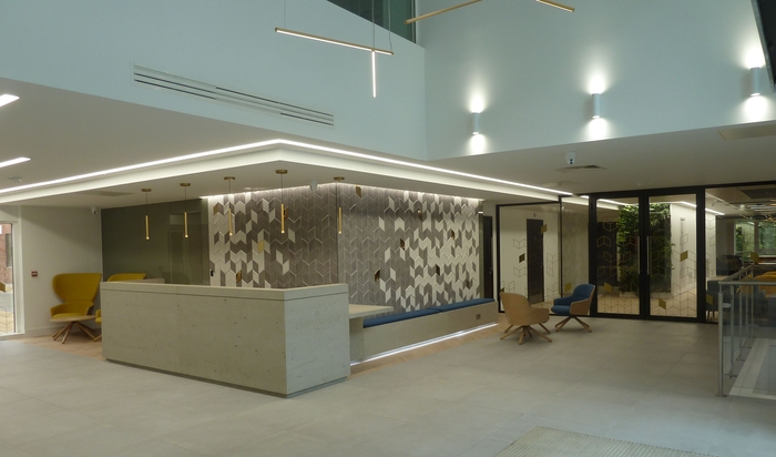 Leeds based Castlehouse Construction completed the programme of works despite a challenging climate during the pandemic. The building now offers 6 floors of Grade A office accommodation arranged over lower ground, ground and four upper floors, providing floorplates from 3,089 sq ft – 13,117 sq ft wrapped around a new landscaped courtyard. The building also features a prestigious, new business lounge for informal meetings, as well as on-site parking for 46 cars.