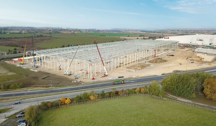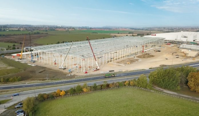 Caddick Construction, Panattoni’s build partner for the landmark Yorkshire project, is on site to progress the 515,820 sq ft warehouse. The steel framework is now fully formed and cladding being added.