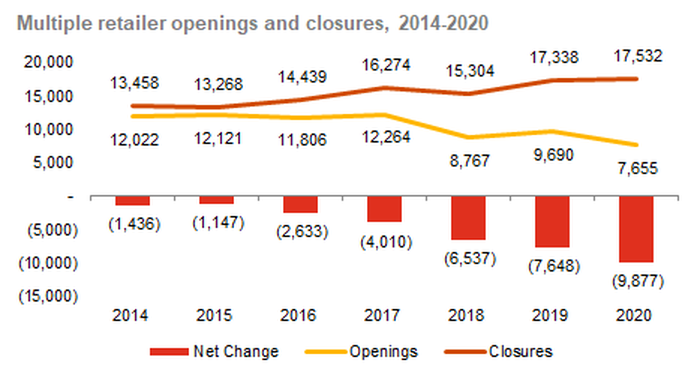 Almost 10,000 chain stores disappeared from Great Britain’s retail locations in 2020. In total, 7,655 shops opened, compared to 17,532 closures, a net decline of 9,877, according to PwC research compiled by the Local Data Company (LDC). Although a decline was to be expected in a pandemic this is the worst ever seen with an average of 48 chain stores closing every day, and only 21 opening.