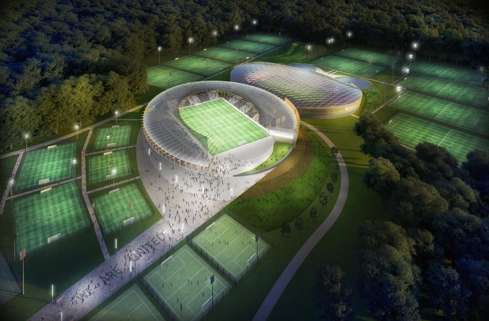 “Facilities include a timber diagrid ETFE transparent roof, designed to maximise daylight to the training pitch, inward-looking and protected massing to provide safety and privacy, and a 60-bed hotel, offering on-site accommodation and living spaces for academy players, along with more temporary living space for visiting teams and families.