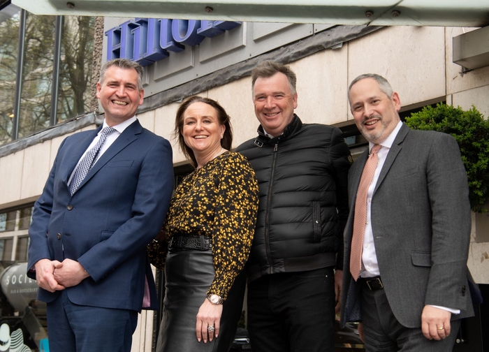 Outside the Hilton London Olympia hotel; outside the hotel, from left to right: Stephane Weit manager of London Olympia hotel, Jo Allen CEO Frogmore, Gerard Nolan C1 Capital joint venture partner, Oliver Stockland Hilton Hotels area manager.