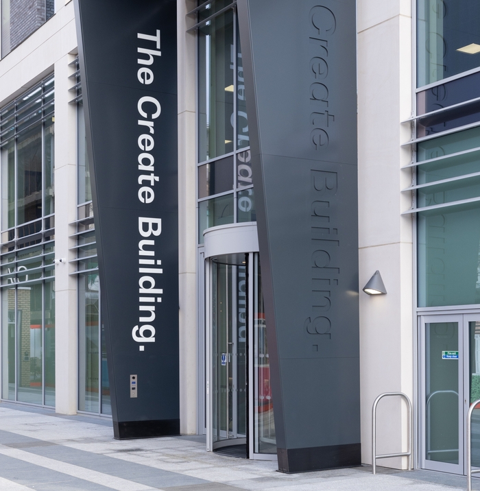 The Create Building development is home to approx. 14,000 sq ft on each floor, has a target for BREEAM Excellent rating and an EPC of high B. Grade A specifications include metal ceiling tiles, raised access floors, fan coil air conditioning, showers with drying rooms, four 17-person passenger lifts and secure parking at 1:350 sq ft.