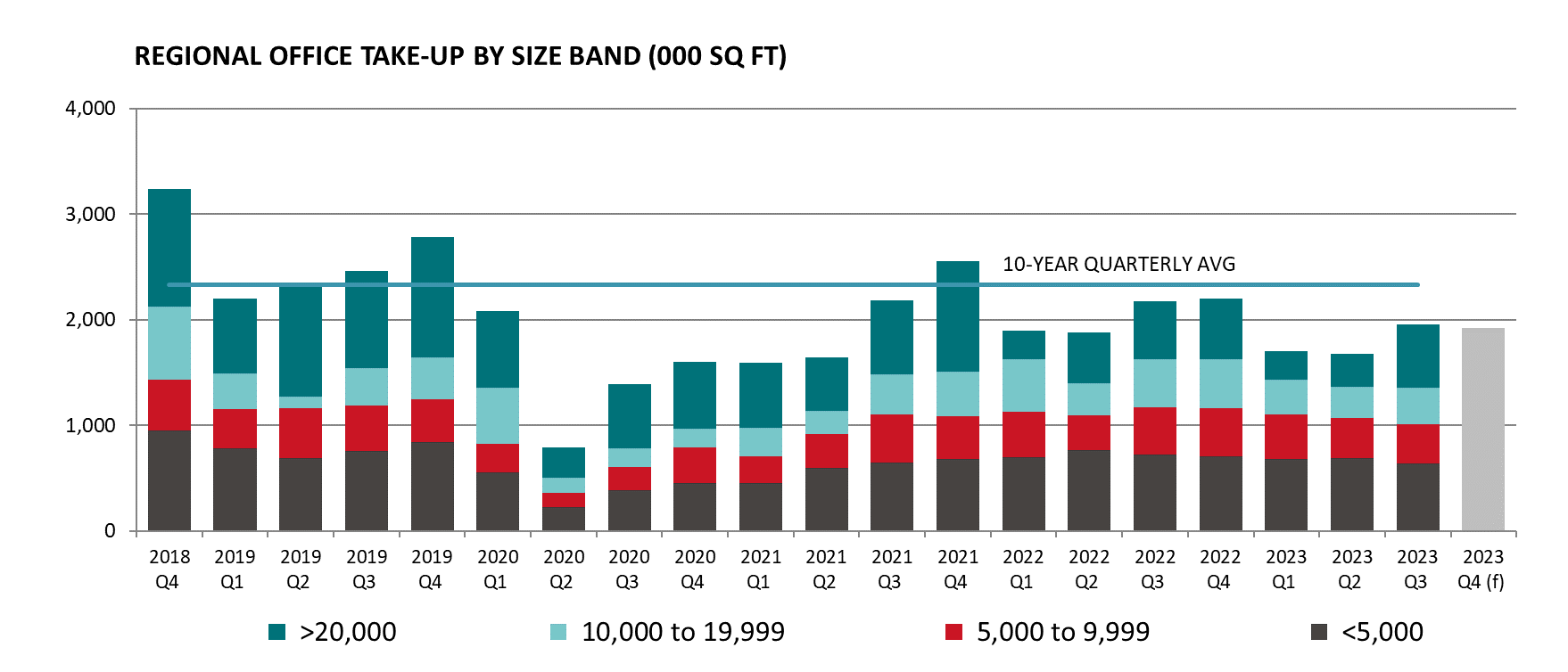 Including the forecast for the final quarter, take-up across the 20 key regional markets for 2023 is on course to hit circa 7.2m sq ft, 12% below 2022’s total and 22% below the 10-year annual average.