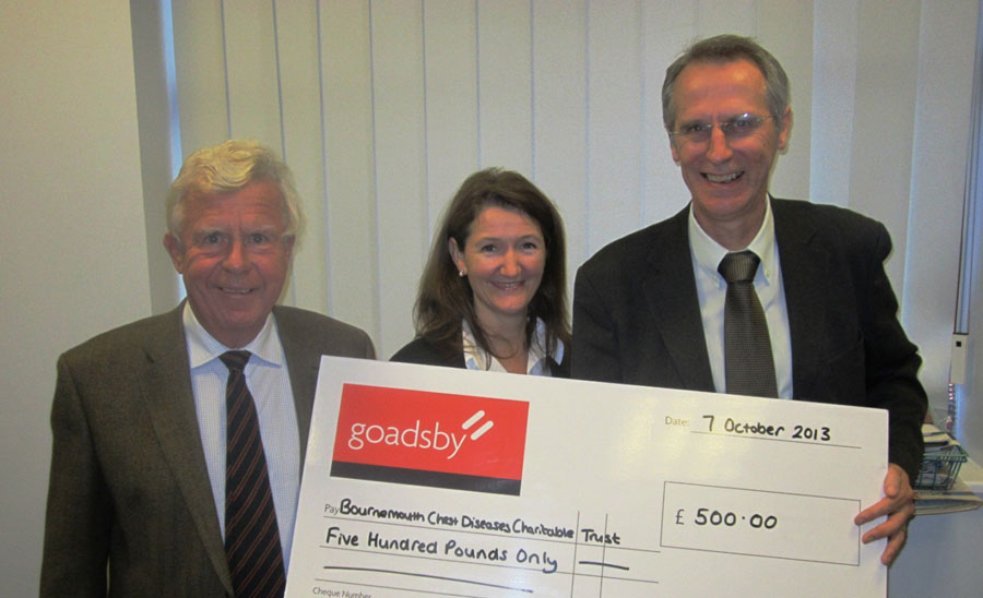 Goadsby have donated £500 to Bournemouth Chest Diseases Charitable Trust (BCDCT) recently at Bournemouth Hospital. Pictured is Marcus Andrews FRICS (right) with Dr Jonathan Turner (left) and Dr Di Laws (Centre) of the Trust.