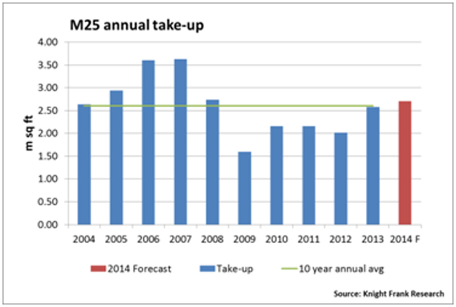 Figures released by Knight Frank reveal that vacancy levels in the M25 declined sharply in the final quarter of 2013.