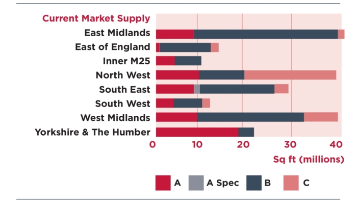 Supply stands at only 32 million sq ft (2,972,897 sq m), according to the research, of which 6.5 million sq ft (603,869 sq m) is classified as Grade C stock and not-fit-for purpose for today’s logistic requirements. The report shows 51% of take-up has been for build-to-suit units adding to the increasing scarcity of land in prime industrial locations.