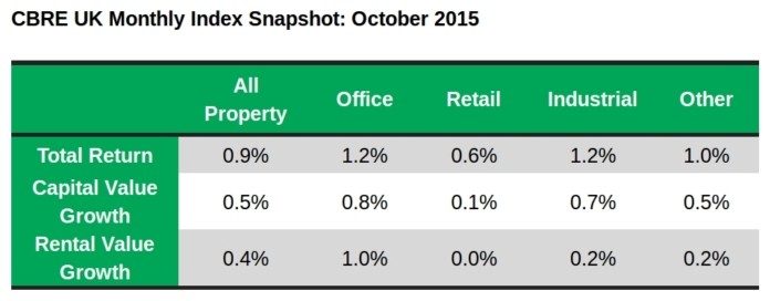 Capital values are also growing fastest in the London office market, at 1% in October, some way ahead of the 0.6% for offices outside London, and twice as fast as the 0.5% growth seen across all commercial property. Together, the rising rents and capital values in the UK office market are giving investors total monthly returns of 1.2%.