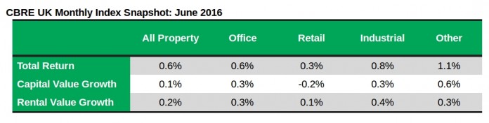 Commercial property rents across the UK grew by 0.2% in June, matching the trend for the year to date despite uncertainty in the build up to the EU referendum, according to the latest CBRE Monthly Index. Capital values grew by 0.1% over the month, a drop on 0.2% in May. But the 0.6% total returns for the month matched returns seen almost every month of the year to date.