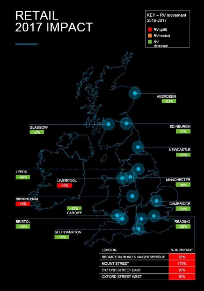 Retailers in 11 out of 14 UK cities will see their average rateable values decrease in the 2017 business rates review, according to analysis from CBRE.