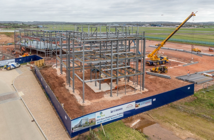 Speculative building at St. Modwen’s 1.4 million sq ft Skypark scheme in Exeter is forging ahead as steel frames go up on the first of two new office buildings on site this month.