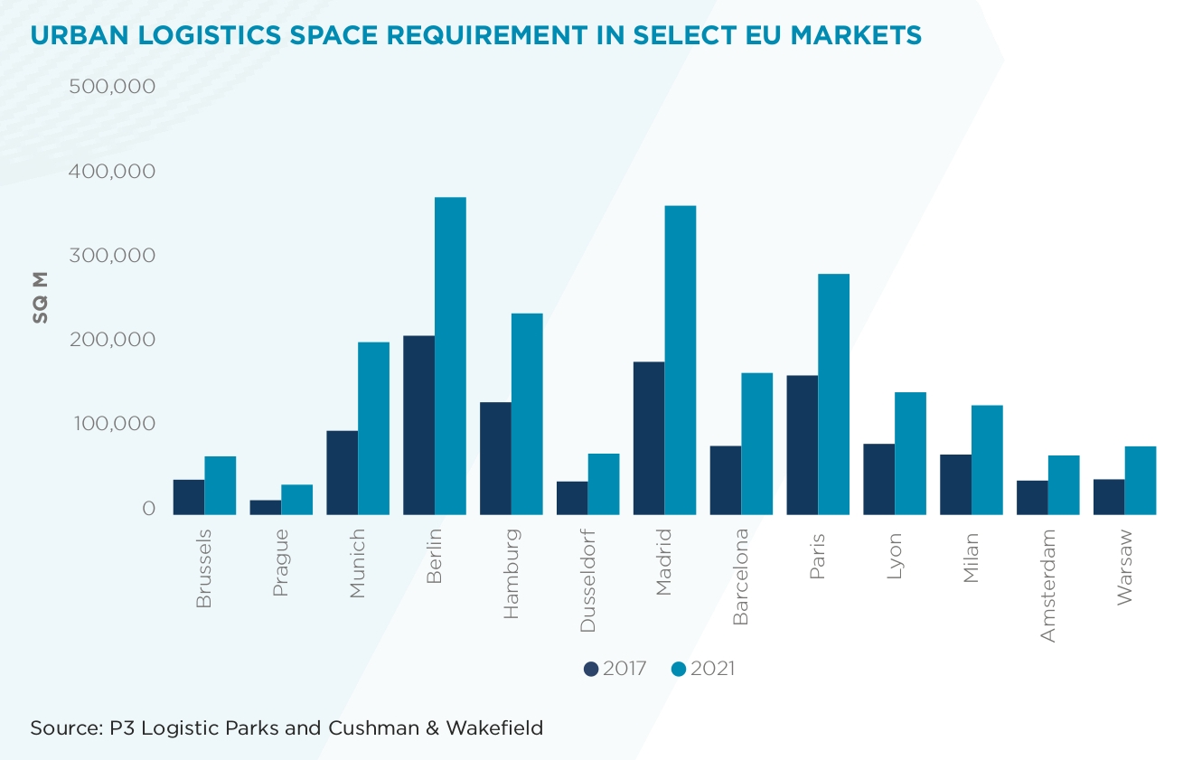 The Urban Logistics report uses Cushman & Wakefield’s ‘Urban Space Model’ – developed in partnership with P3 Logistic Parks – to quantify total urban logistics space requirements in Europe’s top eCommerce markets based on current and future online sales volumes.