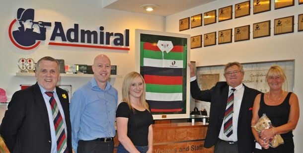 Huw Thomas (chair), Phil Dobson (treasurer) & Anthony Evans (Public Relations) of Wooden Spoon Wales presented a framed Wooden Spoon rugby shirt with a plaque & accompanying certificate to Jason Merchant (Admiral Facilities Project Manager). A Wooden Spoon teddy bear was also presented to Administrator Steph Scott who coordinated the fundraising team along with Receptionist Laura Wride.