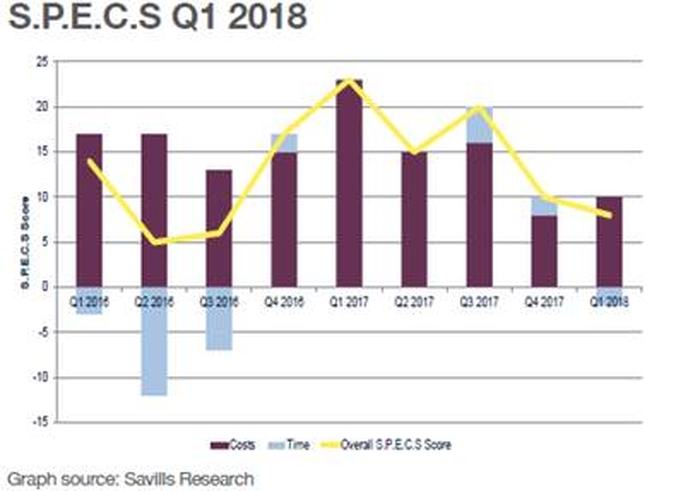 The overall S.P.E.C.S score for Q1 2018 is eight (a score above zero demonstrates that costs and timescales are generally rising, whereas a score below zero indicates a fall)**, which is the lowest quarterly score since the results of the EU referendum was announced in June 2016. A return to these levels is an indicator that ongoing uncertainty is continuing to impact on both costs and timescales across all sectors.