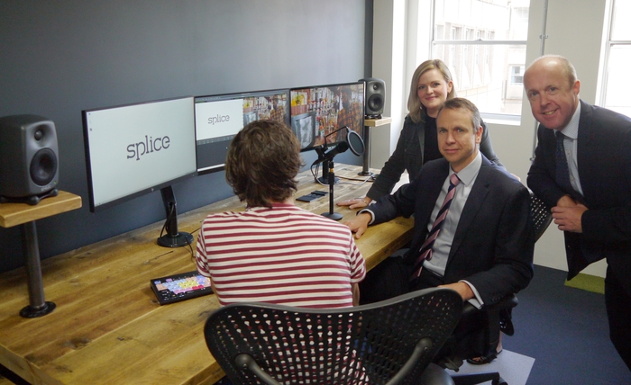 Splice facility manager Louise Sutton, Mark Sutton of Knight Frank and Gary Carver of Savills in one of the new Splice edit suites at 101 Cardiff with Splice operations manager Sam Linforth (back to camera).