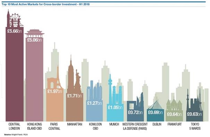 In the first half of 2018 £5.6 billion of international capital was invested in the London commercial real estate market. Hong Kong was second with £5 billion and Paris third with £1.9 billion.