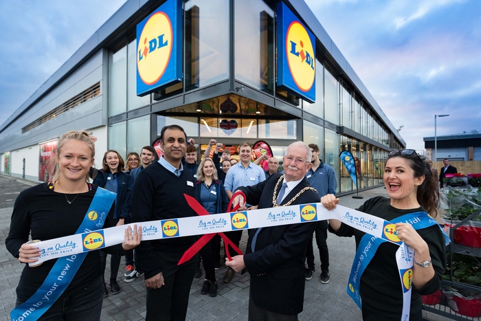 Mayor of Cheltenham Councillor Bernard Fisher cut a ribbon as the doors opened for the first time this morning to Lidl customers at the Tewkesbury Road store.