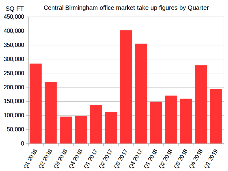 Office take up in quarter one, 2019 in the central Birmingham office market totalled 193,984 sq ft, according to figures compiled by the Birmingham Office Market Forum.
