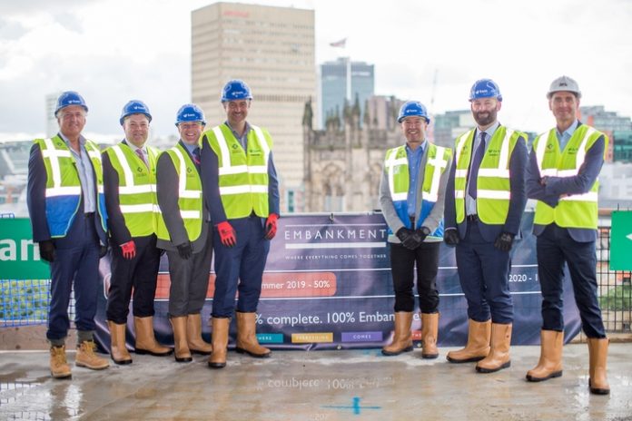 Dignatries gathered this week to mark a major milestone in the delivery of 100 Embankment, as this second and final building at this development reaches its highest point.