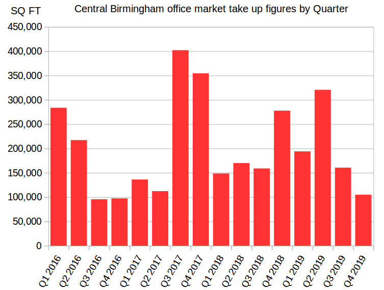 Office take up in quarter four, 2019 in the central Birmingham office market totalled 104,893 sq ft in 26 deals.