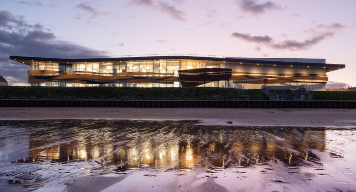 The design by Glasgow based BMJ Architects is heavily influenced by the building’s location beside the sea. Weathered Corten steel solar shading wraps the façade like water lapping against a sea wall with a striking entrance inspired by a ship’s sail. The wave shaped roof floats above a clear glazed façade, providing stunning views over the Fife coastline.