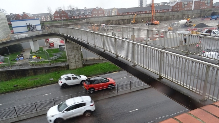 With the temporary absence of a bridge, pedestrians can cross the main road via nearby ground level lights-controlled crossings at the foot of Albert Row and Princess Way. Thousands use these crossings safely on a regular basis and many more used them safely to access the recent Waterfront Winterland.